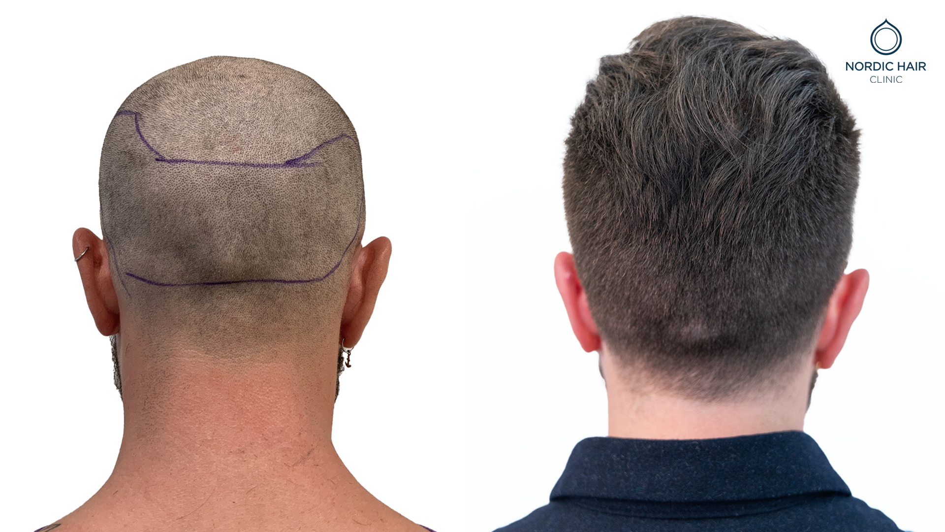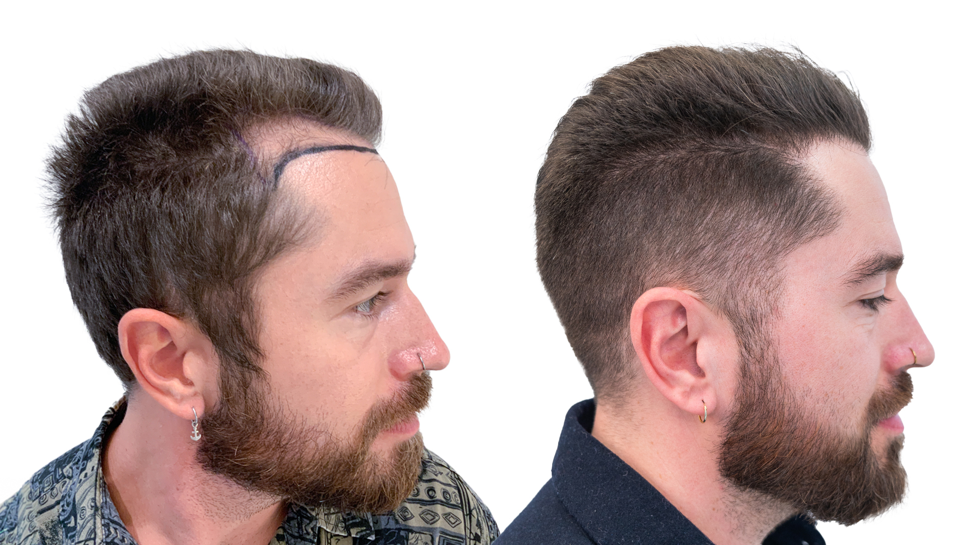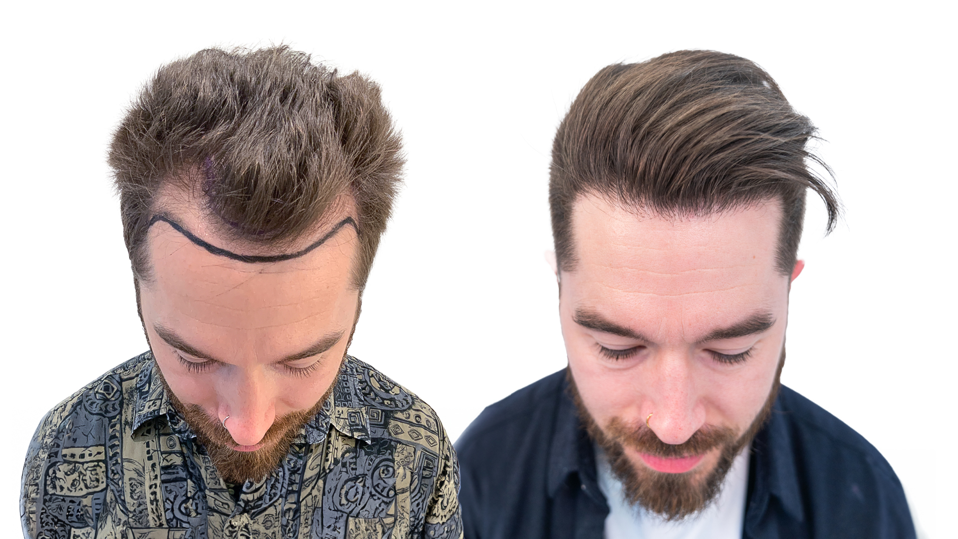 Efter at have gennemgået en hårtransplantation i løbet af det seneste år, ser vi, at Davids hår er blevet tykkere og fyldigere. Nyt hår er vokset frem og har fyldt områderne ud, hvilket skaber en tydelig og fyldig hårgrænse. David fik en hårtransplantation på 1.600 grafts for at rette sin hårgrænse og udfylde sine høje tindinger.