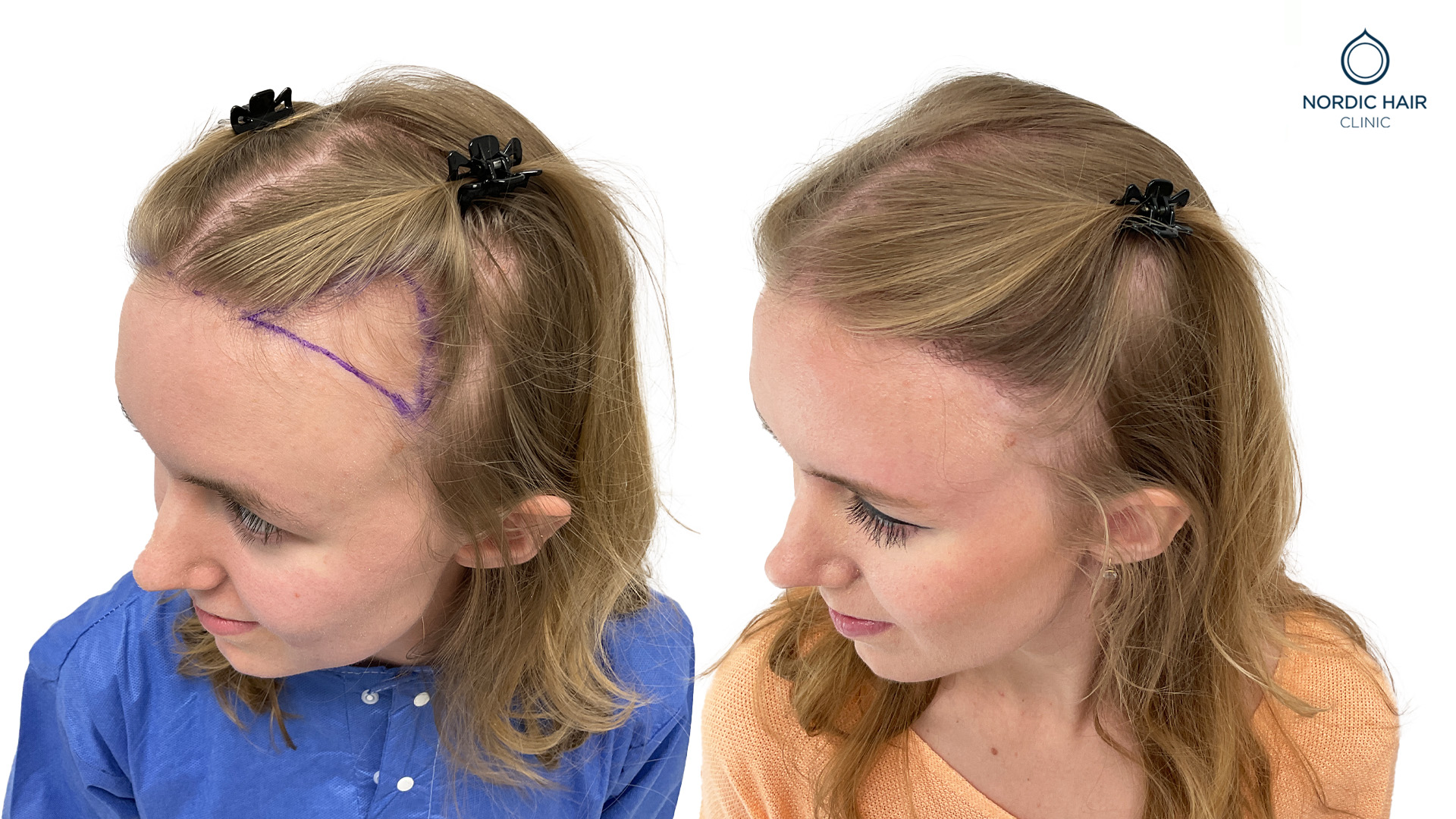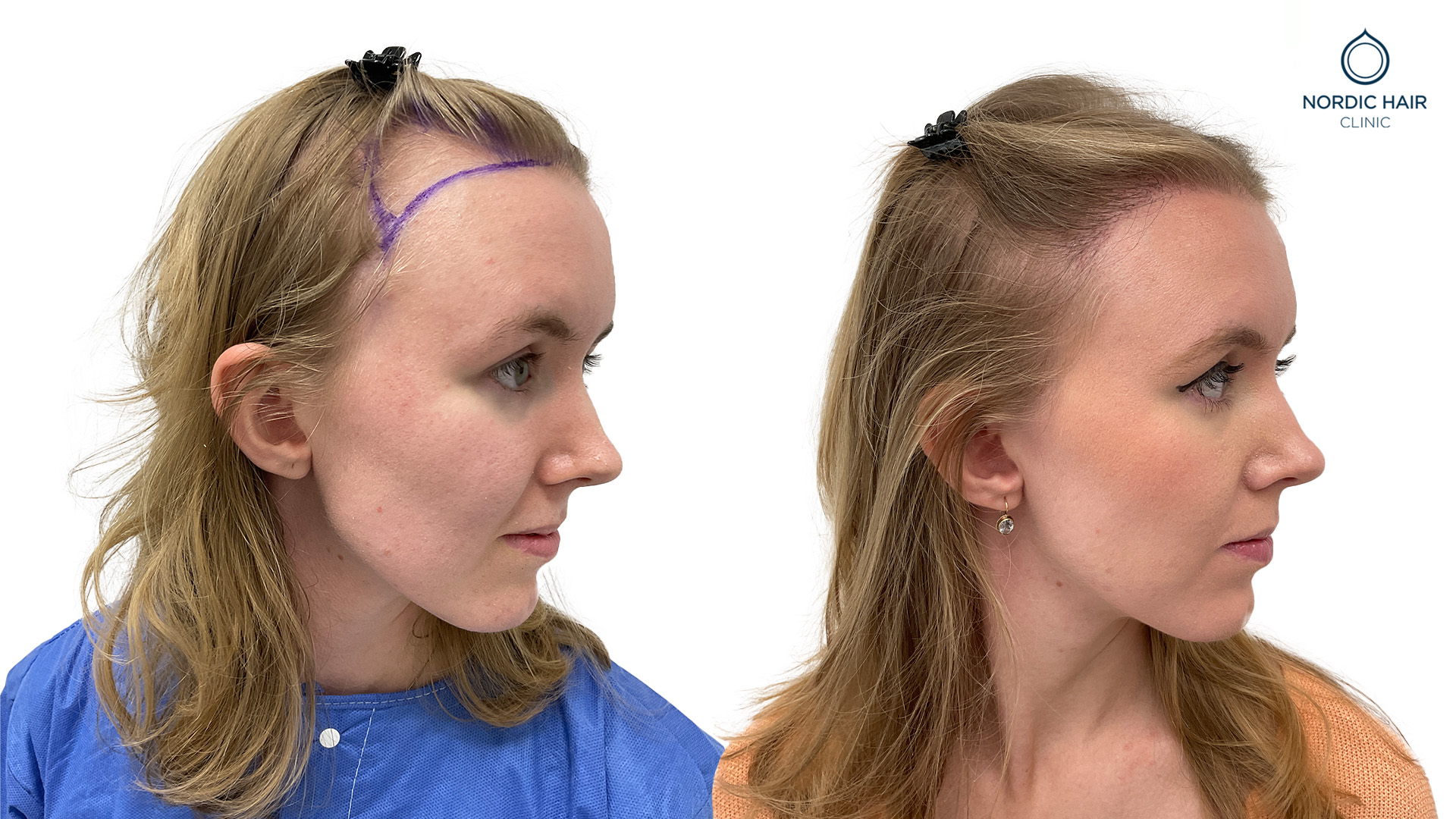 Caroline begynte å legge merke til at hårfestet hennes gikk tilbake og at hårfestet ble høyere og høyere. Hun henvendte seg til oss for å få hjelp med en hårtransplantasjon og få tilbake sin naturlige hårfeste.