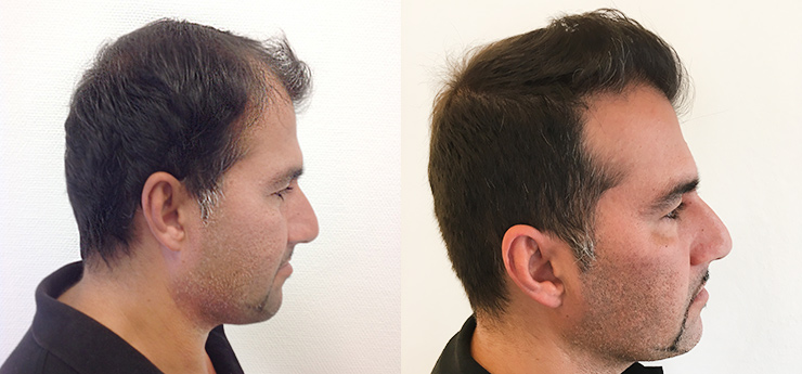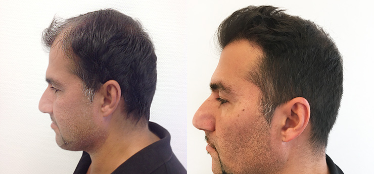 Sharam begynte å bli tynnhåret i buktene, mot hårfestet og også litt oppover mot kronen. Med 2000 grafts fikk han en ny hårfeste og toppen av hodet fylt.